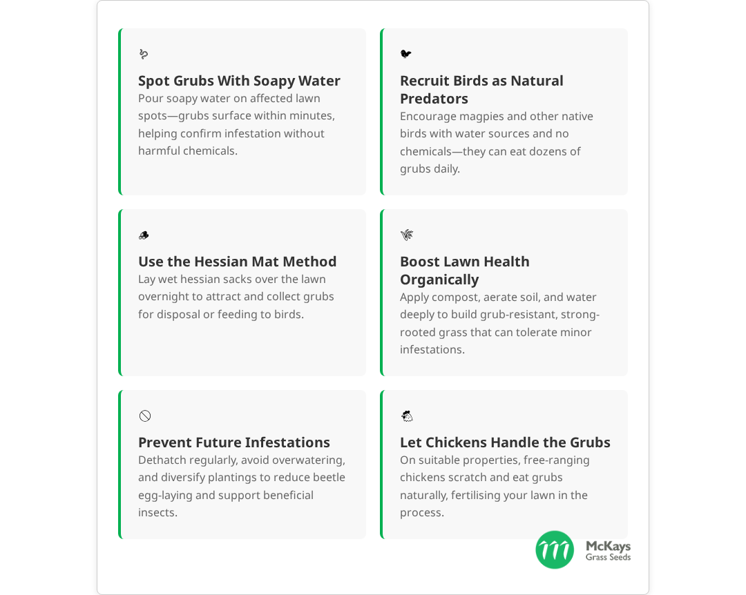 - Multiple sources document that native Australian birds, particularly magpies, actively consume lawn grubs and can provide significant natural control when encouraged.