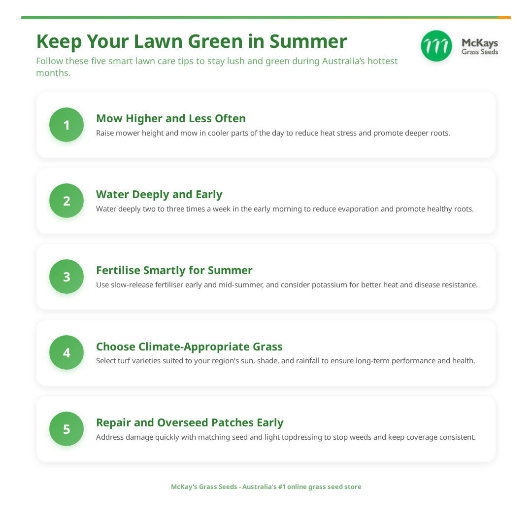 Summer fertilising should be tempered compared to spring. Heavy nitrogen in very hot weather can force soft leaf growth that is more drought prone. Use a slow release or controlled release fertiliser timed for early summer and again mid summer if the lawn is actively growing. That keeps carbohydrate reserves and root systems healthy.