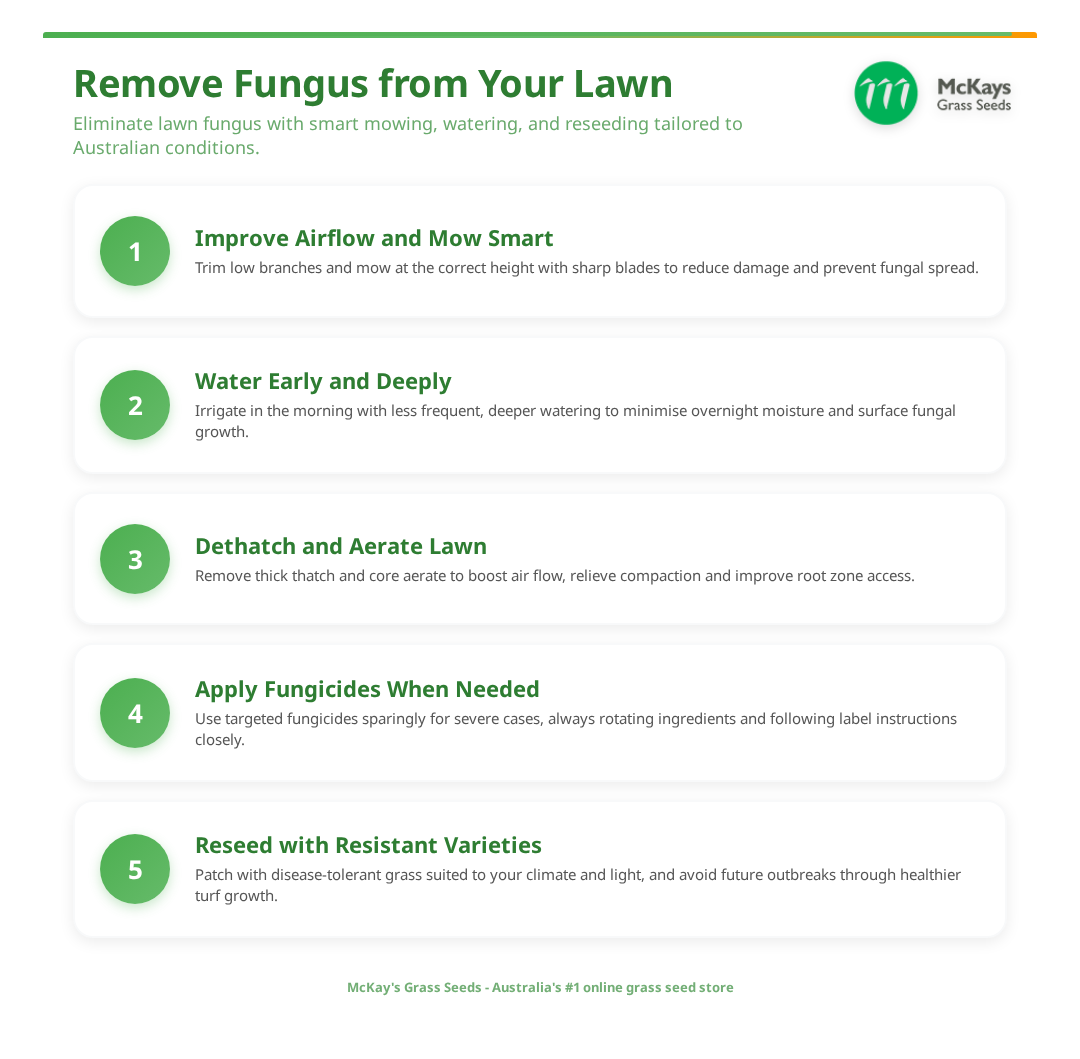 If the fungus is spreading despite following these steps, or you have a high traffic sports area, it is sensible to consult a professional. Persistent root diseases or complex pathogens may need diagnostic testing and a targeted plan. Our team of lawn experts are available online, by phone (1300 703 491) or email (customersupport@mckaysgrassseeds.com.au) all day to assist with customer enquiries. This is what they do all day, every day.