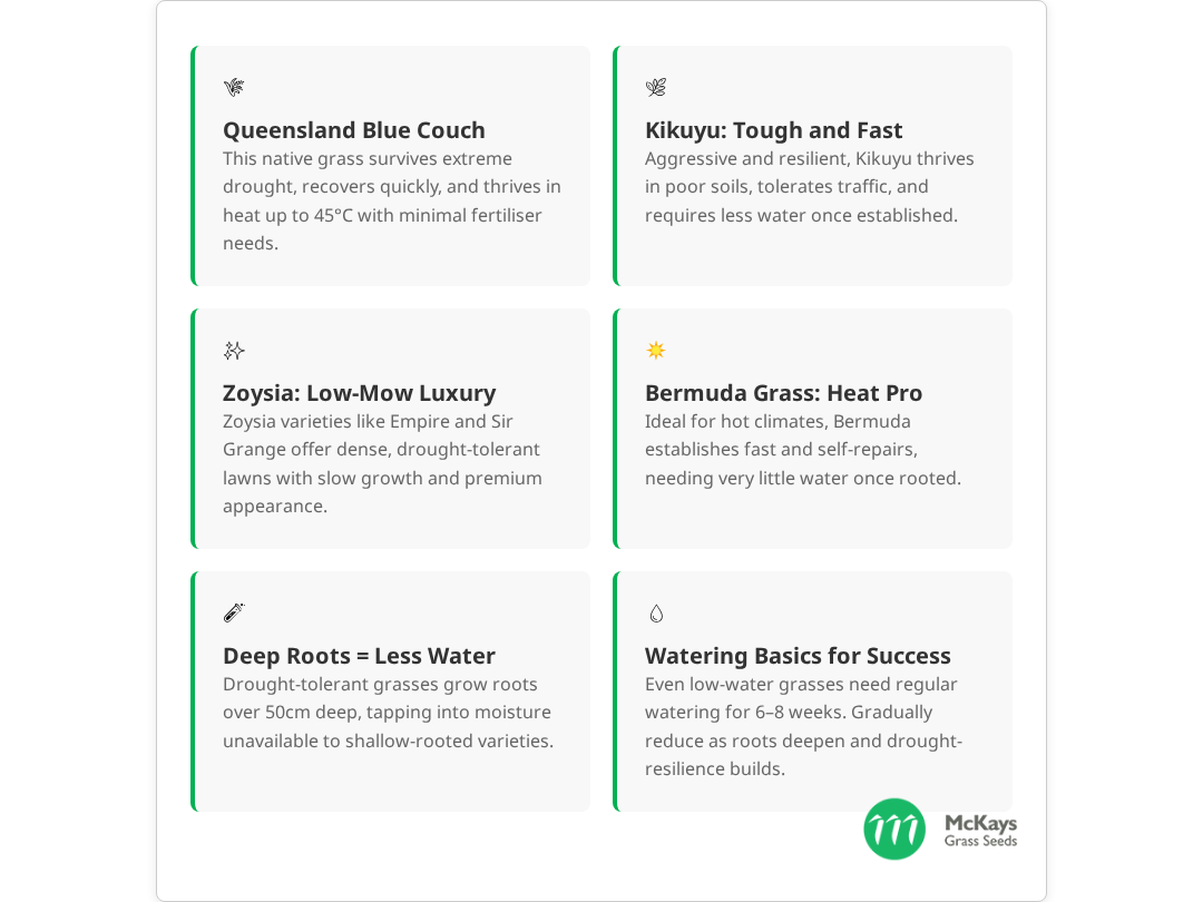 | Queensland Blue Couch | Very Low | QLD, NSW, NT | 4-6 weeks | Extremely drought hardy, fast spreading, heat tolerant |