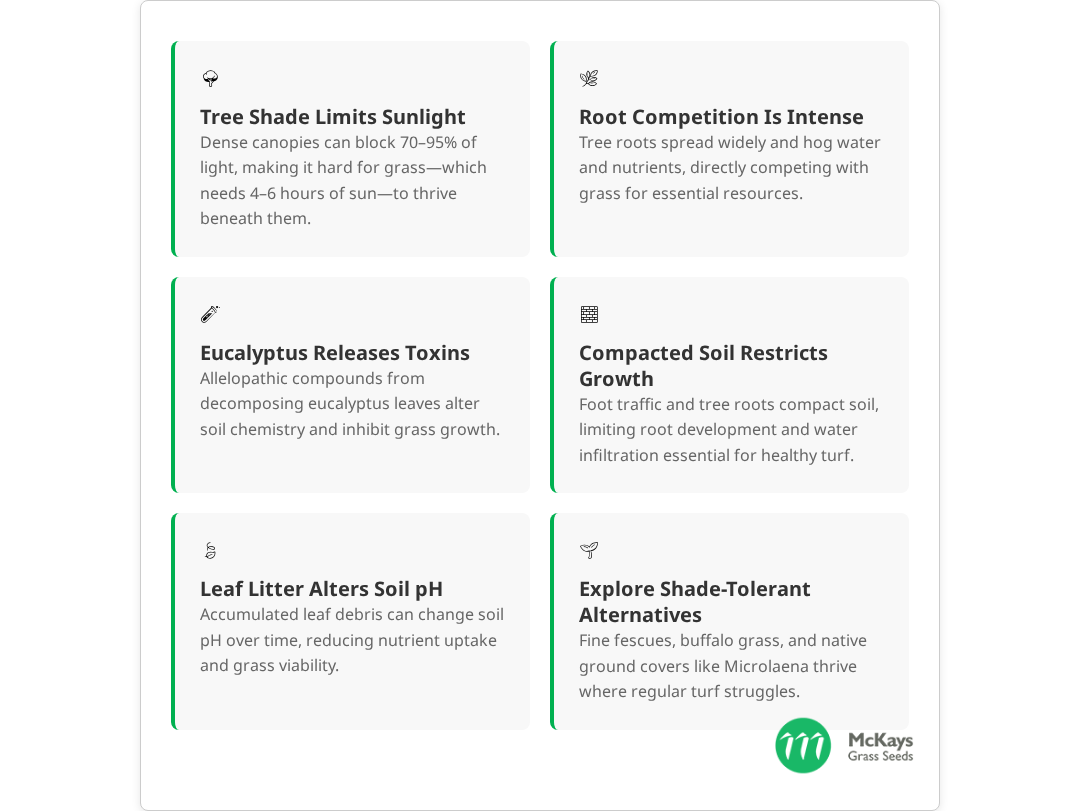 At McKay’s Grass Seeds, we understand that every property presents unique challenges. Our team can provide personalised recommendations based on your specific tree species, soil conditions, climate zone, and maintenance preferences. Whether you’re looking for shade-tolerant grass varieties or exploring alternative ground cover options, we’re here to help you create a landscape solution that works.